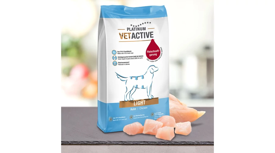 A PLATINUM VETACTIVE Light kutyatáp kiegyensúlyozott diétás étrendet biztosít kedvencének, amely kíméli a hasnyálmirigyet és teljes ízélményt nyújt. A kiváló minőségű összetevők, valamint a csökkentett energia- és zsírtartalom elősegítik a kutya súlyának csökkentését, illetve megtartását.